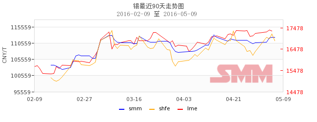 SMM錫簡(jiǎn)評(píng):今日開盤112340元/噸,受到周末公布的中國(guó)4月對(duì)外貿(mào)易數(shù)據(jù)疲弱的打壓,國(guó)內(nèi)商品市場(chǎng)普遍遭遇重挫,滬期錫主力一路震蕩下行,最低觸及110030 元/噸,最終收盤110770元/噸,較前一日下跌590元/噸,跌幅0.53%。成交33068手減8242手,持倉(cāng)10624手減242手。
