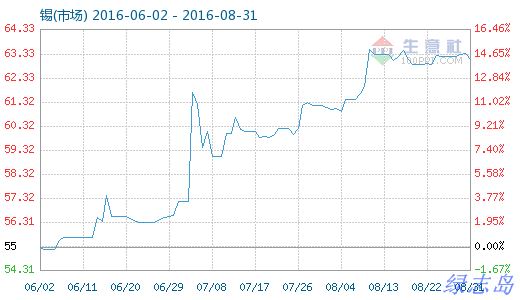 8月31日錫(市場)商品指數為63.11,較昨日下降了0.25點,較周期內最高點100.25點(2011-09-05)下降了37.05%,較2015年12月09日最低點42.86點上漲了47.25%。(注:周期指2011-09-01至今)